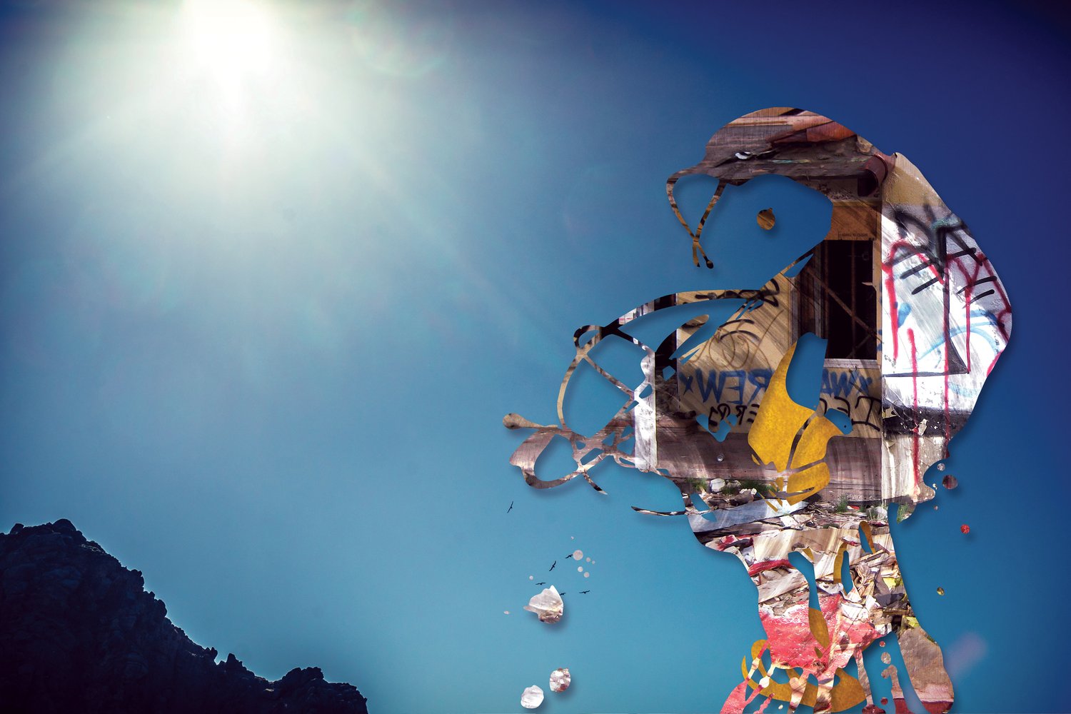 The top two layers of this piece are cut shapes affixed to the back photo with 1/4" spacers making this work three dimensional. The middle blue shape is spray painted matte aluminum. The top and background pieces are plexiglass.